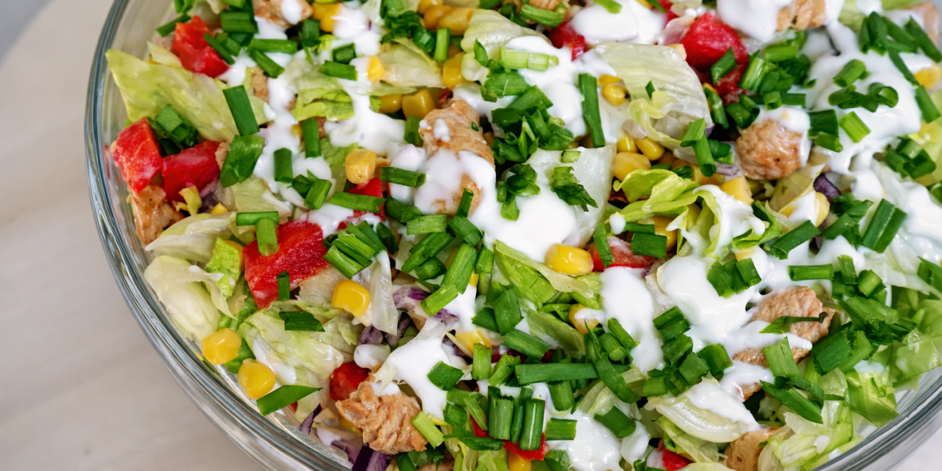 Цей салат ідеальний на випадок, якщо ви хочете з’їсти щось ситне, але не дуже калорійне. Деякі можуть назвати його фітнес-салатом завдяки здоровій йогуртовій заправці.
