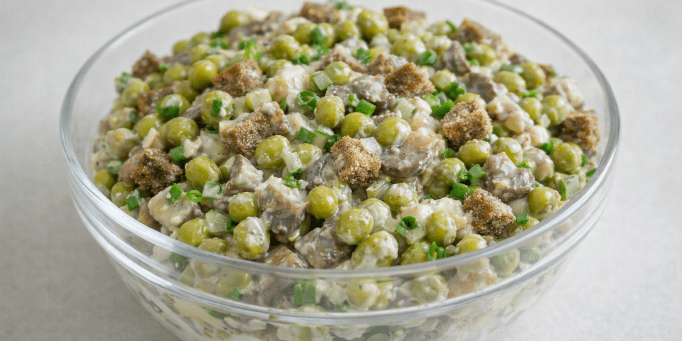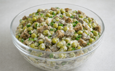 Салат з шампіньйонами та сухариками — універсальний, легкий у приготуванні та може стати справжньою прикрасою вашого столу завдяки гармонійному поєднанню інгредієнтів! Ніжні печериці та горошок створюють контраст з хрусткими сухариками, що сподобається любителям різних текстур у тарілці.
