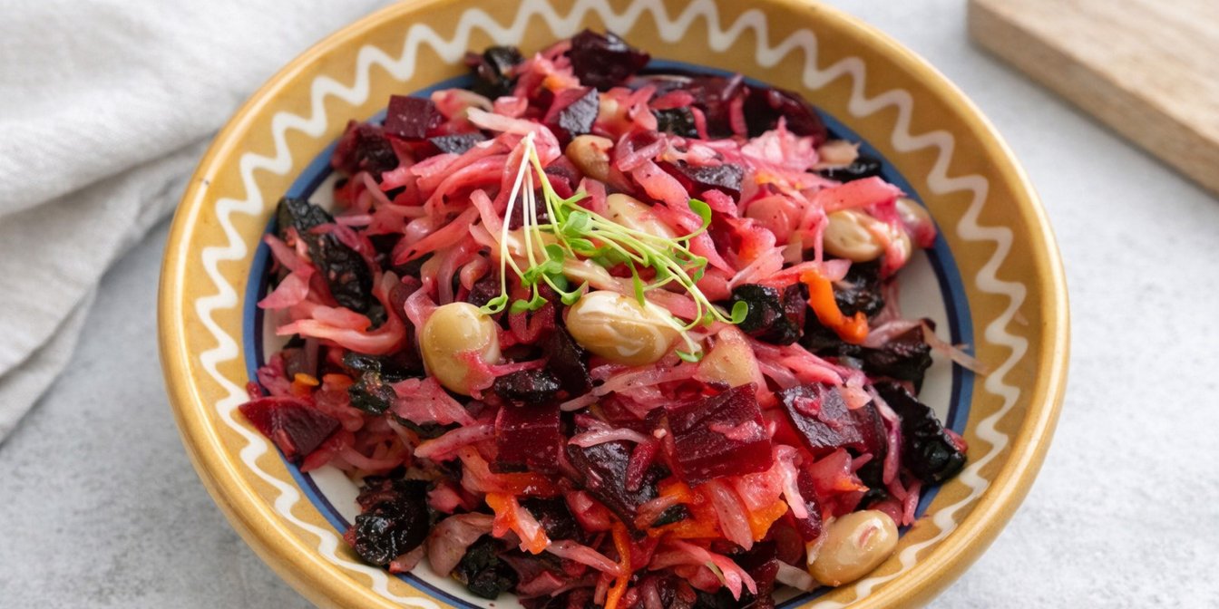 А якщо ви хочете м’ясної страви, приготуйте салат із буряком та чорносливом, у якому є трохи свинини.