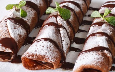 Складаємо млинці вдвоє, намащуємо кремом та згортаємо в рулетик.