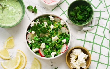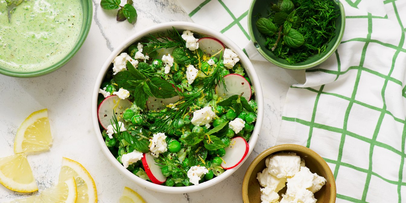 Густа заправка з горошку, грецького йогурту та лимонної цедри чудово доповнить овочі, свіжу духмяну зелень та ніжну фету.