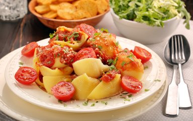Фарширована паста з томатним соусом і двома начинками виходить соковитою, ароматною та ситною — гарний варіант як для сімейної вечері, так і для гостей. Фарширувати можна різні види пасти: черепашки, конкільє або канелоні.