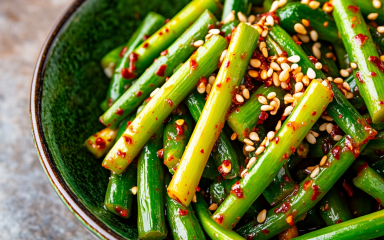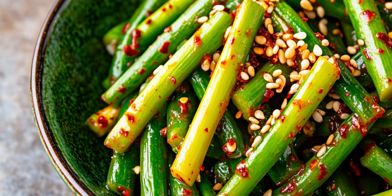 У цьому рецепті часникові стрілки бланшують, а потім змішують із соєвим соусом, оцтом, гострою пастою гочуджан і краплею кунжутної олії — усе для тієї самої «корейської магії», яка перетворює будь-які овочі на кулінарне задоволення.