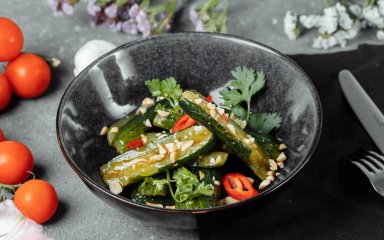 Цей рецепт огірків по-корейськи у пакеті — порятунок тих, у кого немає часу. Огірки нарізав, інгредієнти для маринаду на основі соєвого соусу змішав, струсив все у пакеті й поставив у холодильник. Через кілька годин у тебе буде пікантна закуска до м’яса, риби, картоплі.