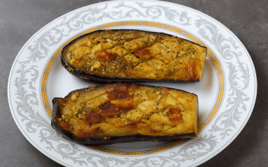 - Такі баклажани можна готувати в духовці при 180° С. Але в такому разі помідори та часник додавай наприкінці запікання. Запікання зберігає більше користі баклажанів.
