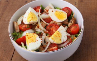 У глибокій мисці з’єднай нарізані помідори, порубані яйця і цибулю. Посоли до свого смаку і полий олією. Акуратно перемішай.