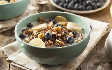 Солодка кіноа на горіховому молоці з ягодами, приготована за рецептом нутриціологині Анастасії Голобородько, — поживна страва з високим вмістом білка, клітковини та корисних жирів. Кіноа має природно горіховий смак і добре поєднується зі свіжими або замороженими ягодами, насінням, какао-бобами, кленовим сиропом.