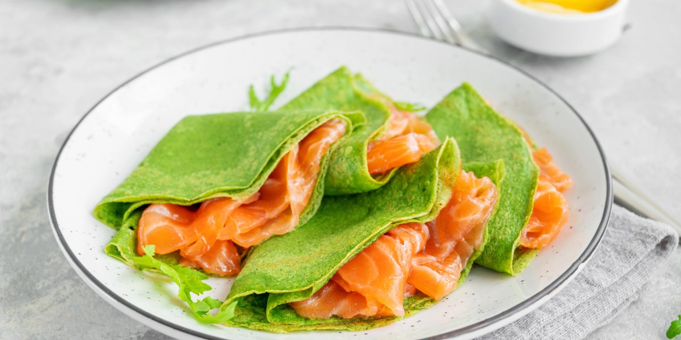 Червона риба містить омега-3 жирні кислоти, які корисні для мозку й серця. Авокадо — джерело корисних жирів, огірок і салат — клітковини. Завдяки такому поєднанню шпинатний млинець з лососем виходить збалансованим і поживним.