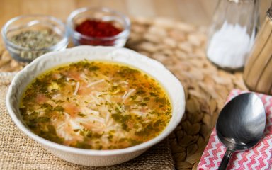 Дай супу настоятися 10 хвилин. За цей час вермішель дійде до готовності, а всі смаки «подружаться». Доведи до смаку сіллю та перцем.