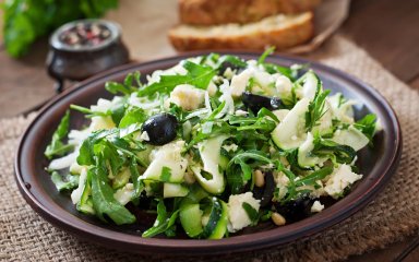 Прикрась руколою і оливками.