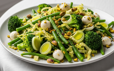 Якщо шукаєш ситну овочеву страву без м’яса, теплий салат з овочами та моцарелою в духовці — це вдалий варіант. Броколі дає текстуру, стручкова квасоля — колір, капуста — соковитість, порей — легку гостроту.