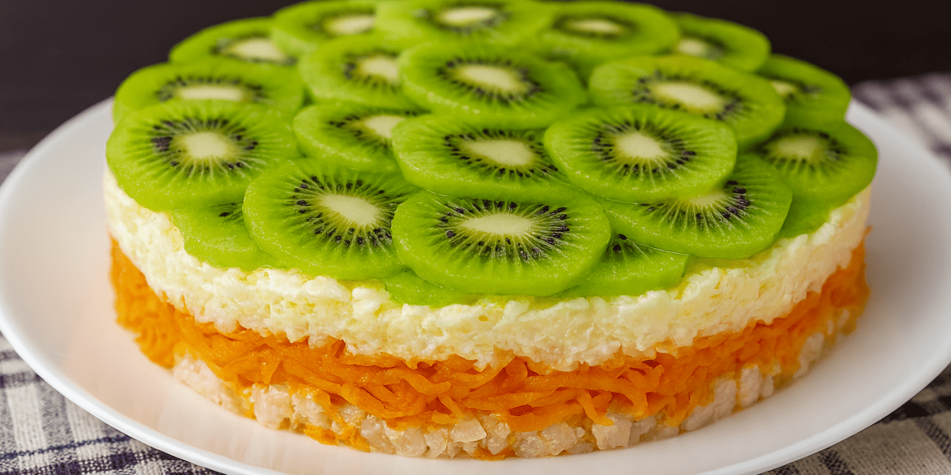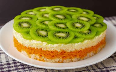 Почисть дозрілі ківі та наріж тонкими слайсами, виклади зверху салату.