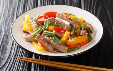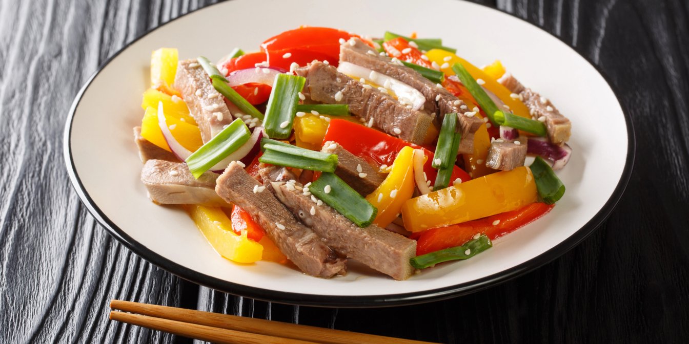 У теплому азійському салаті з яловичиною важливу роль відіграє заправка з соєвого соусу зі спеціями. Саме вона надає знайомим інгредієнтам характерного східного присмаку. Готується все швидко: поки смажиться м’ясо, ти встигаєш підготувати овочі — перець, огірок, цибулю.
