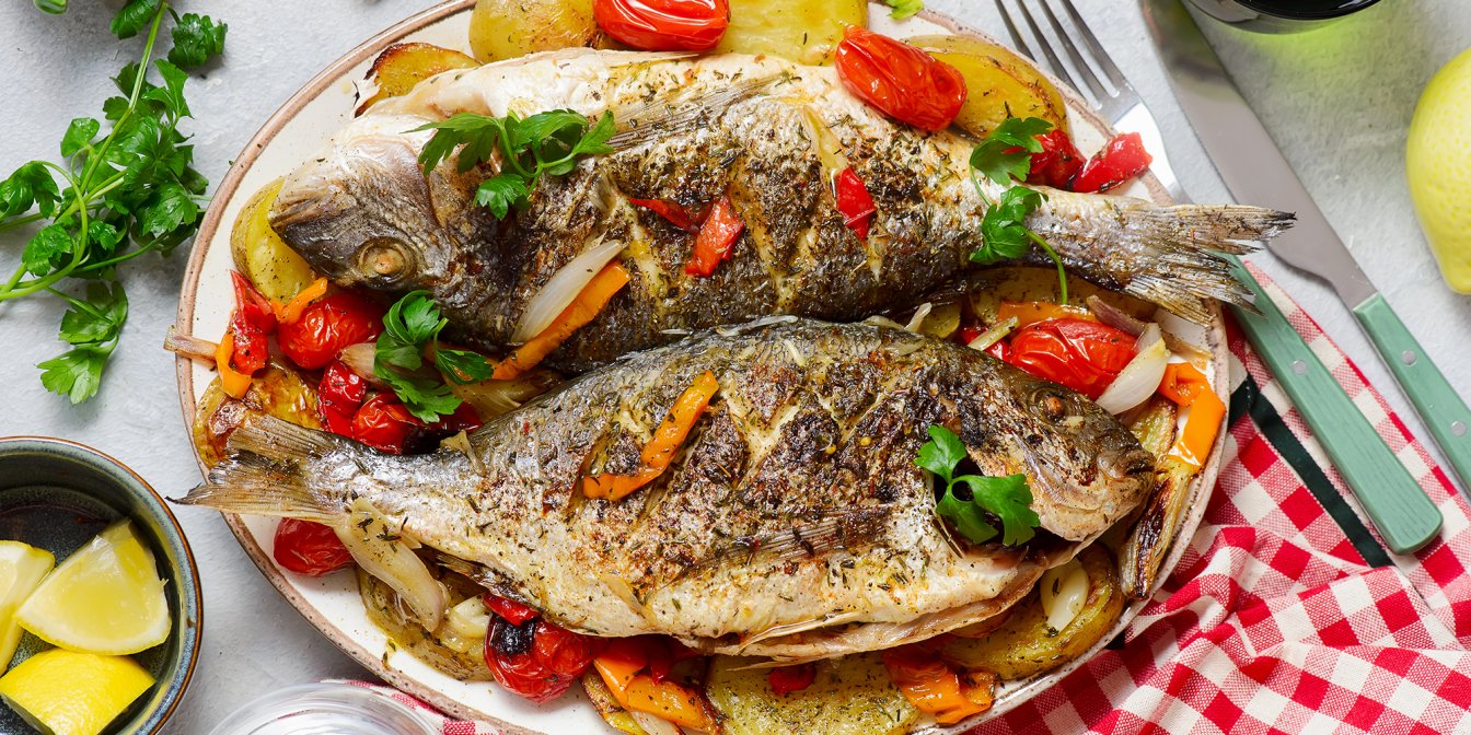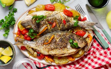 Соковита дорадо в духовці з овочами — виходить ніжною та насиченою, при цьому залишається дієтичною. Картопля, перець, цибуля й часник утворюють ситний гарнір, просочений оливковою олією та пряним орегано. Приготування запеченої дорадо займає близько години, але тобі знадобиться мінімум зусиль — треба лише відправити рибу в духовку.