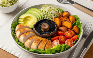Боул з курячим філе, авокадо та грибами — це збалансована страва, що складається з окремо приготованих інгредієнтів, які викладають у миску порційно. Такий підхід дозволяє поєднати різні текстури: хрумкий салат, м’який батат, соковите куряче філе й кремове авокадо. Цей боул з куркою та грибами може бути частиною раціону без глютену, адже не містить зернових.