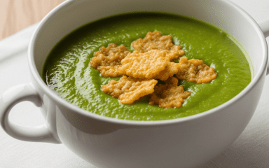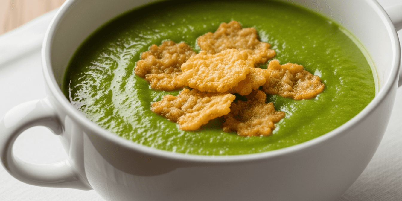 Зелений суп із пармезаном — це теплий кремовий суп із пряним смаком, насичений зеленню та білком. У цьому рецепті поєднуються прості інгредієнти та незвична подача — із хрусткими пармезановими чипсами. Такий суп із пармезаном може стати ситною та корисною основною стравою або закускою в прохолодний день.