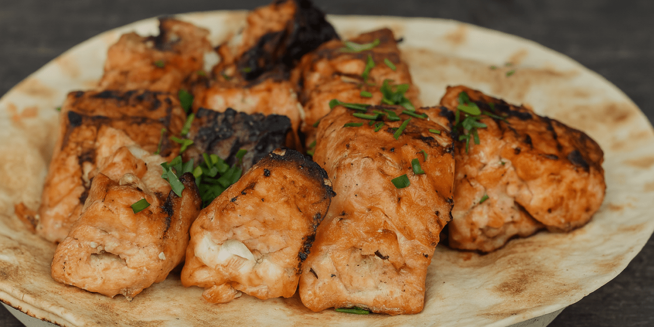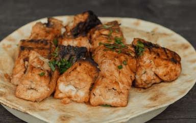Нанижи шматочки риби на шампури. Готуй над розжареним вугіллям 10-12 хвилин, періодично перевертаючи. Орієнтуйся на рум’яну скоринку й м’яке м’ясо без крові біля хребта.