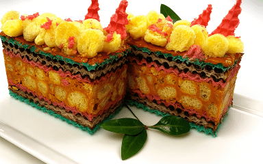 Подавай пляцок, нарізавши його тонким гострим ножем на невеликі шматочки. За бажанням верх можна прикрасити залишками глазурі або кількома кружальцями кукурудзяних паличок.