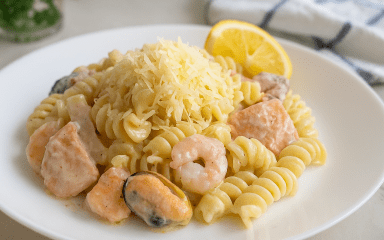 До страв на зразок пасти з соусом або локшини з додатками належить і вермішель з морепродуктами. У ній поєднується тонка макаронна основа, вершковий соус і морський коктейль. Такий формат приготування властивий середземноморській кухні, де морепродукти часто замінюють м’ясо.