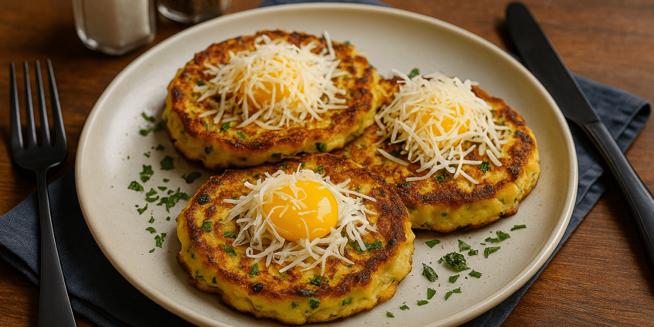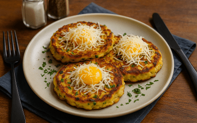Переверни оладки та виклади зверху яєчний жовток.За бажання присип додатково сиром, накрий кришкою та смаж ще 2-3 хвилини. Подавай сніданок гарячим разом з овочами чи улюбленим соусом.