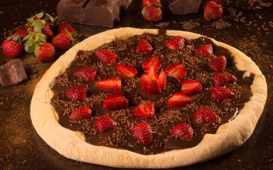 Розподілити сирну масу, лишаючи краї тіста вільними. Зверху розкласти полуницю і рівномірно присипати страву цукром з крохмалем. Краї тіста підняти до верху, злегка їх притиснувши.
