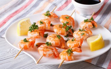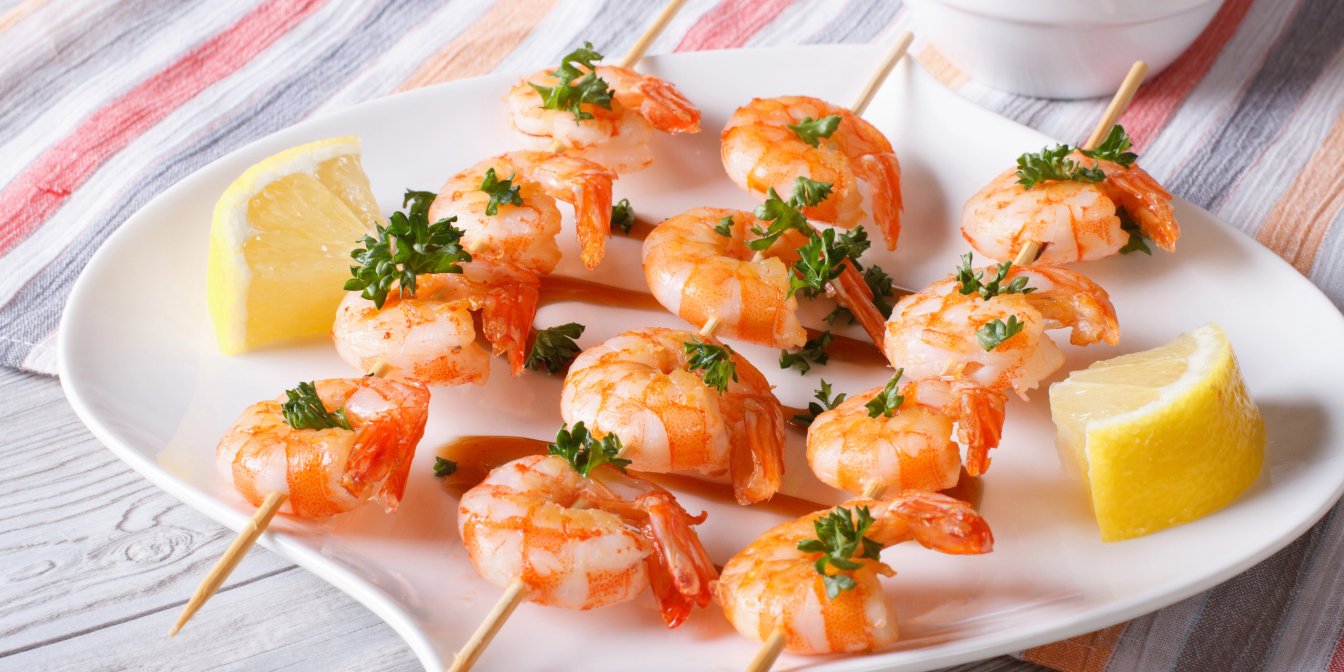 Готуємо стильну закуску з морепродуктів (свіжих або свіжоморожених) — креветки на шпажках, смажені на грилі. Цей рецепт креветок не потребує особливих спецій і нескладний у приготуванні. Ніжний смак і хрумка скоринка — це те, за що люблять цю страву. А ще — за те, що з цією закускою можна зробити гарні фото для свого блогу.