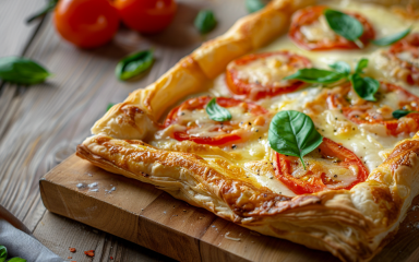 Слойка «Капрезе» з соусом песто — це варіація класичного італійського салату в форматі випічки. Такий салат з помідорів у поєднанні з томатів у поєднанні з хрустким листковим тістом та ароматним песто стає цікавою закускою. Цей рецепт слойки з томатами та сиром зручно готувати вдома й подавати теплим.