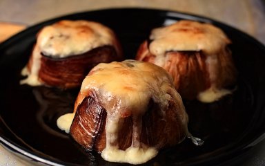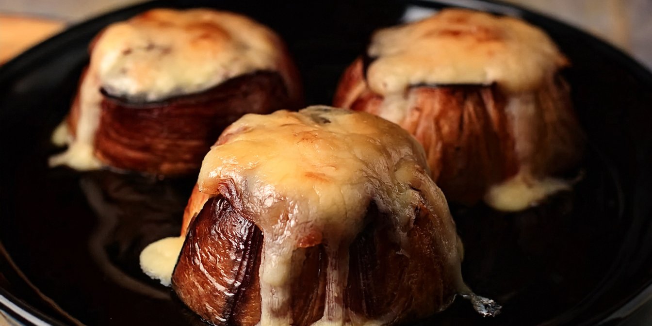 Дістаємо фаршировані баклажани перевертаючи їх на форму, щедро додаємо зверху натертий маасдам та ставимо в духовку запікатись на 10-15 хвилин при температурі 200 градусів.