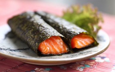 Після того як знімеш шкіру, розріж філе на 4 шматочки. Посоли та змасти кожен шматочок соусом теріякі. Обгорни шматочки у лист норі.
