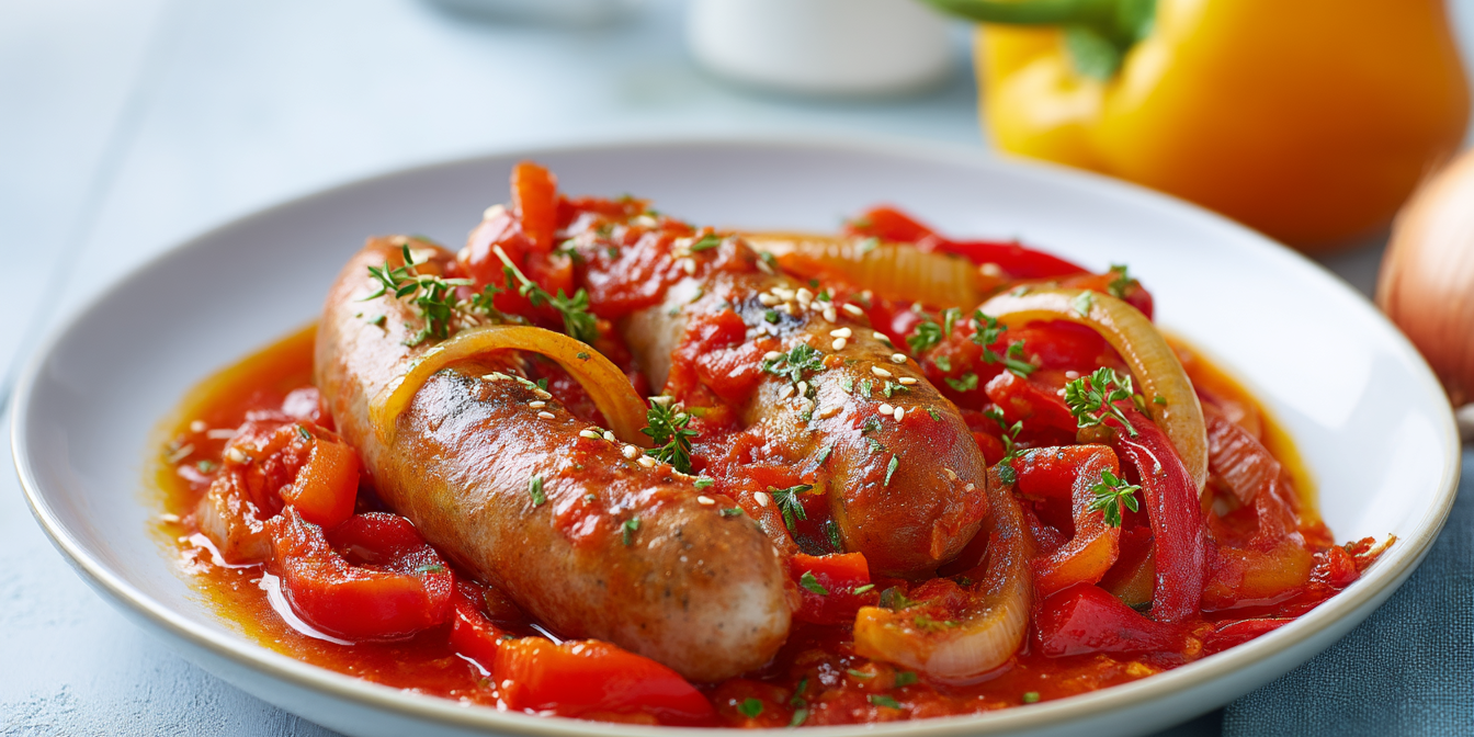 Додайте сосиски, залийте соусом і підсмажте усе разом ще кілька хвилин.