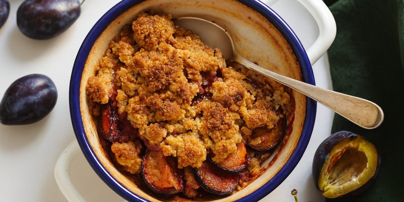 Сливовий крамбл з вівсянкою — це один із найпростіших варіантів фруктового десерту. У цьому рецепті поєднуються соковиті сливи та хрустка крихта з вівсянки, що робить його схожим на звичайний вівсяний пиріг. Такий крамбл зі сливами зручно готувати навіть новачкам — він не потребує замішування тіста чи використання міксера.