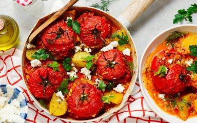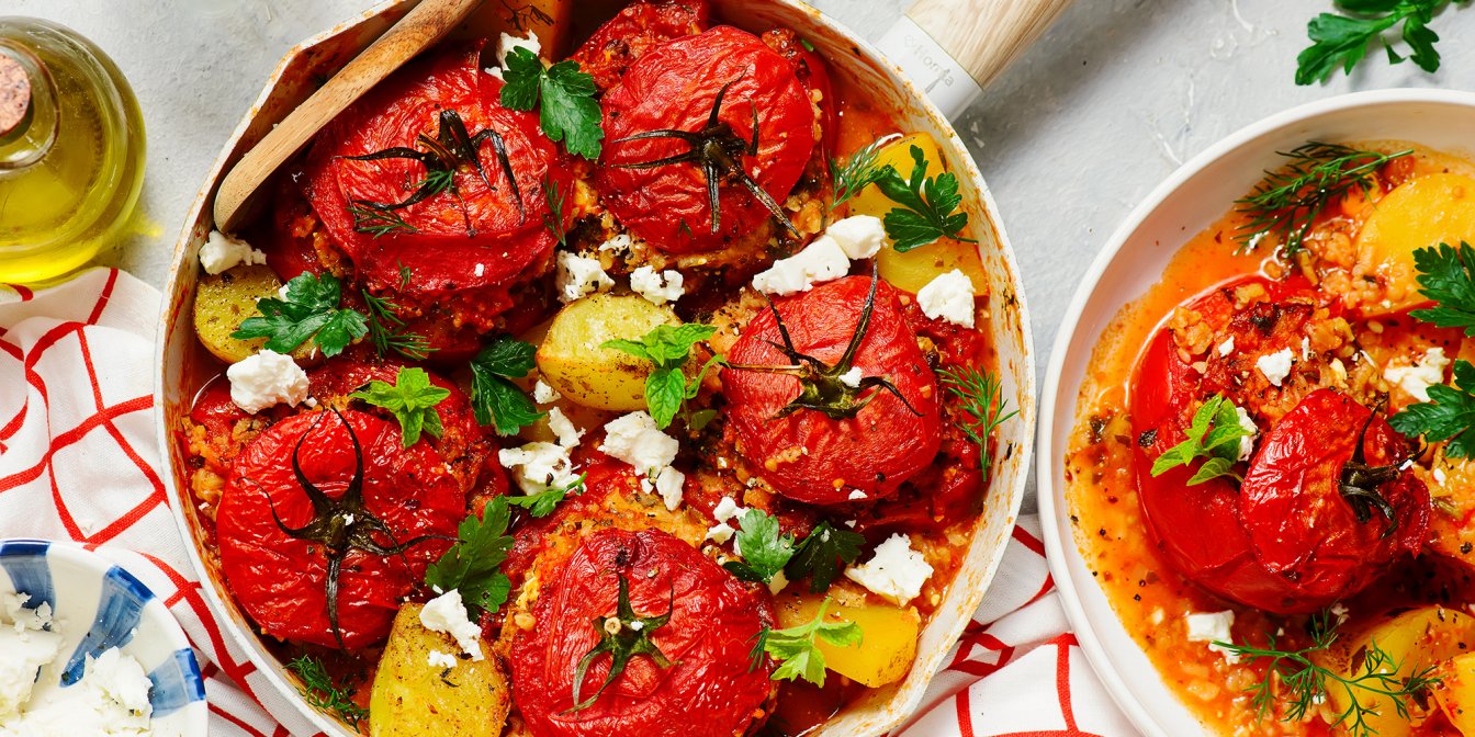 Грецькі фаршировані томати — класична середземноморська страва. Соковиті стиглі помідори начиняються ароматною сумішшю з рису, зелені, фети й маслин. Запікаються разом із картоплею в томатному соусі — ідеально для обіду або вечері.