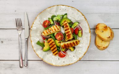 Салат із сиром халумі та овочами — це ситне і смачне поєднання овочів, смаженого сиру та класичної заправки. Завдяки особливій структурі халумі, він не розтікається при смаженні, а зберігає форму.