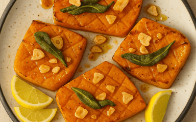 Стейки з гарбуза з часниковим маслом — це веганські стейки, запечені в духовці з ароматним маслом і травами. Завдяки хрусткій скоринці та м’якій середині вони стануть цікавою альтернативою м’ясній страві. Такий рецепт можна приготувати як для святкової вечері, так і для повсякденного обіду.