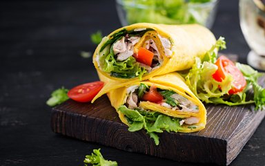 Перекладаємо сирно-овочеву основу на дошку дном догори та змащуємо зверху соусом песто. Потім зверху шарами викладаємо почергово: нарізану моцарелу, руколу, шматочки томатів, авокадо та хамон. Загортаємо все в рол.