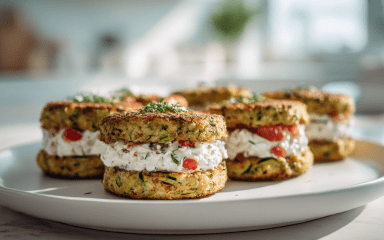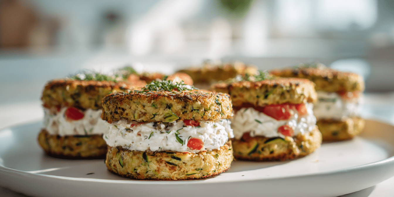 Кабачкові бургери — це цікаве переосмислення рецепта класичного бургера, в якому замість булочки використовуємо обсмажені в кукурудзяній паніровці кружальця кабачка. А замість котлети у цій варіації іде сирна намазка з овочами і зеленню.