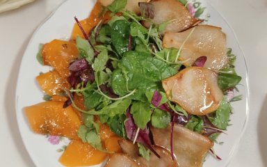 Теплий салат з гарбузом та грушею — це сезонна страва, де гарбуз підсмажується до м’якої карамельності, а груша додає солодкої свіжості. У поєднанні з медово-гірчичним соусом та зеленню салат набуває балансу між солодким, кислим і пряним смаком.