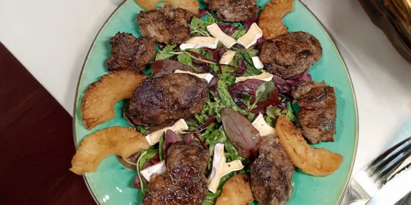 Теплий салат з печінкою та ананасами — це незвичне поєднання м’ясного та фруктового інгредієнтів. Печінка, обсмажена до золотавої скоринки, зберігає соковитість, а ананас на грилі чи сковороді додає карамельного присмаку. Разом із сиром брі та міксом зелені страва набуває балансу солоного, солодкого й ніжного смаків.