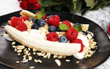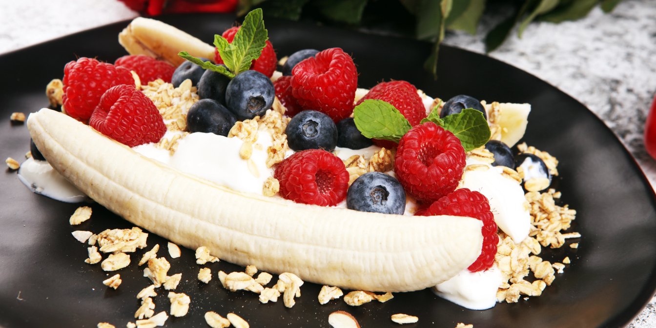 Корисний «Банановий спліт» — це десерт, у якому головними інгредієнтами є банани, йогурт, гранола та ягоди. Завдяки такій заміні морозива цей варіант бананових ласощів має більше білка та клітковини, але менше доданого цукру.