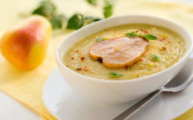 Рецепт супу із карамелізованою цибулею, грушею та горгонзолою