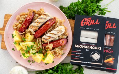 Запечи ковбаски з ароматною цибулею, медово-гірчичним соусом і спеціями, щоб отримати соковиту й рум’яну страву в найкращих німецьких традиціях. Мюнхенські білі ковбаски та копчені бірвурст — чудовий вибір для такої затишної страви.