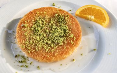 Кюнефе — це східний десерт, що поєднує текстуру тонкої вермішелі з ніжністю сиру. Його особливість у контрасті: хрустке тісто зверху й розтоплений сир усередині. Традиційно його подають гарячим, поливаючи цукровим сиропом і посипаючи горіхами.