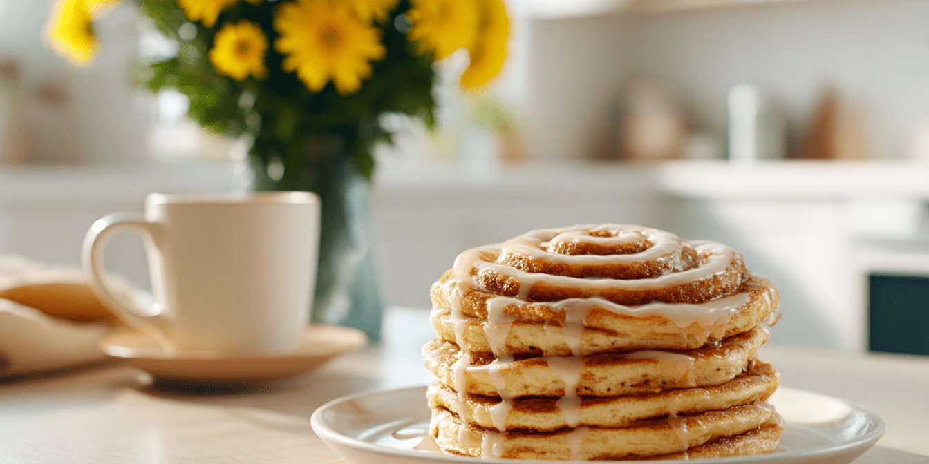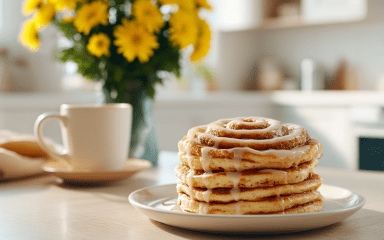 Сніданкові панкейки схожі на сінабони — це пухкі млинці, які готуємо під кришкою і малюємо на них зверху корицею спіраль. Вона красиво карамелізується під час випікання. Для акценту подаємо страву з такою ж глазур’ю, як у булочок з корицею. Тож спробуй швидкий рецепт панкейків без перевертання. Заплануй прготувати їх на вихідних: 20 хвилин — і на столі теплий, ароматний сніданок.