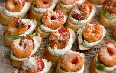 - Подавай брускети одразу після збирання; якщо треба приготувати складники наперед — зберігай крем і креветки окремо до 24 год у холодильнику, а багет підсушуй просто перед подачею.