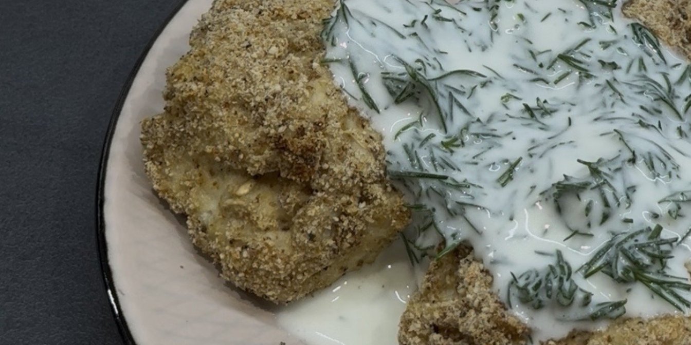 Для соусу змішай йогурт із дрібно нарізаним кропом, лимонним соком, олією та спеціями.