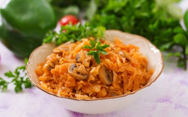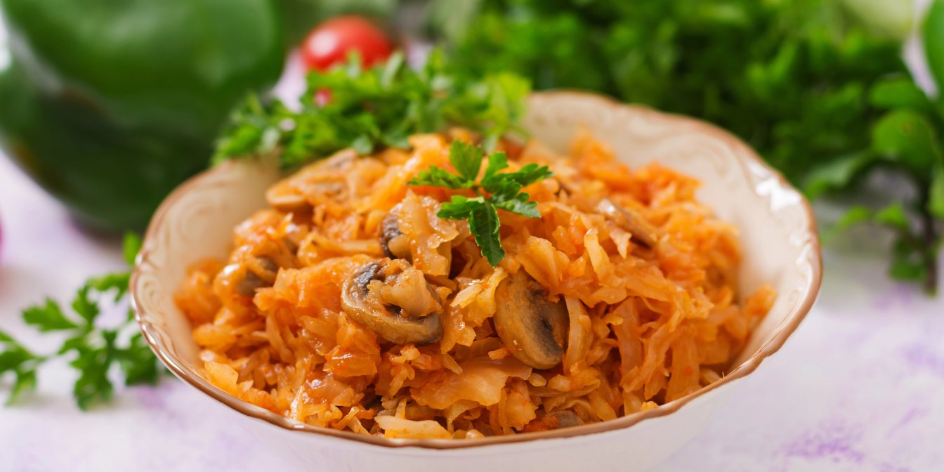 Для цієї начинки для пиріжків потрібні печериці та капуста в однакових пропорціях. Їх обсмажимо з додаванням томатного пюре. Використовуй готову страву для пиріжків на сковороді або подавай як гарнір до м'яса або курки.