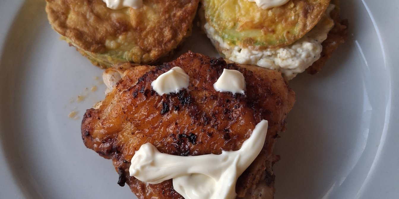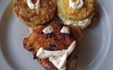 Обсмажені кабачки з курячими стегнами — тепла закуска з сирно-часниковим кремом