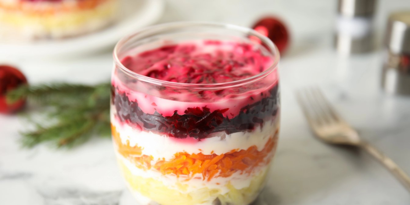 - Формуй салат в одній салатниці, як це передбачають усі рецепти шуби, або рівномірно розділи інгредієнти і зроби шубу в креманках.