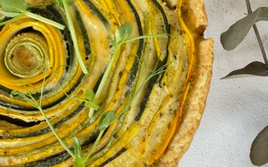 Готуємо кабачковий тарт у невеликій формі 16 см. Складаємо туди крихке тісто, ароматну заливку з вершків, яєць і прованських трав та різнокольорові слайси кабачків, викладені спіраллю. На відміну від класичного кіша із кубиками овочів, тут овочі нарізаються стрічками — це дає ніжну текстуру, приголомшливий вигляд і на додачу ще й рівномірне пропікання. Подавати пиріг з кабачками краще теплим або кімнатної температури — бортики все одно залишаються хрусткими, а серединка — кремовою. Залишки зберігай у холодильнику до 36 годин у щільному контейнері.