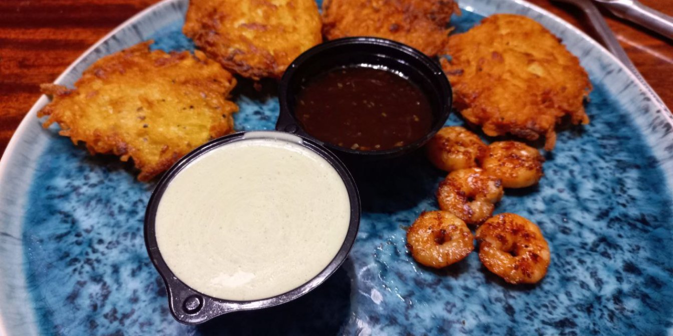 Готуємо не просто хешбрауни: всередині кожної картопляної «подушки» — ціла креветка в тонкому клярі. Контраст текстур працює чудово: хрустка картопля зовні, ніжна креветка всередині. Родзинка — азійський соус: соєвий, кисло-солодкий, з імбиром і легким чилі, який підкреслює солодкуватий смак картоплі та креветок. На відміну від класичних хешбраунів без начинки, тут важливо максимально добре відтиснути картоплю — тоді котлетки не розпадуться і красиво підрум’яняться. Подавай гарячими: полий соусом або подай окремо для вмочування. Залишки легко розігріти в духовці чи на сухій сковороді.